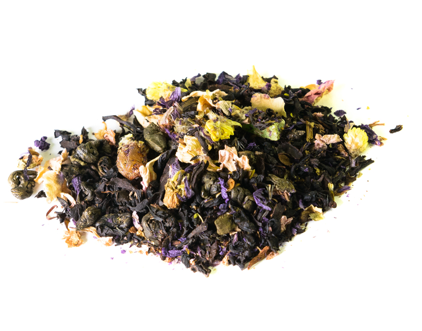 Чай смешанный - Королевский рассвет смешанный представляет собой смесь черного чая и зеленого Ганпаудера с добавлением кусочков ананасов, винограда, персиков, цветков мальвы, розы и бессмертника. Такой богатый состав позволяет не только насладиться великолепным чайным вкусом, но и укрепить организм. Фрукты и ягоды насыщают напиток различного рода витаминами и антиоксидантами, а трава бессмертника в большом количестве содержит магний, калий, кальций, инозин, дубильные вещества, смолы и эфирные масла, которые оказывают сосудоукрепляющее и антиоксидантное действие. Особенно этот чай будет полезен для женщин, так как он отлично восстанавливает гормональный фон.